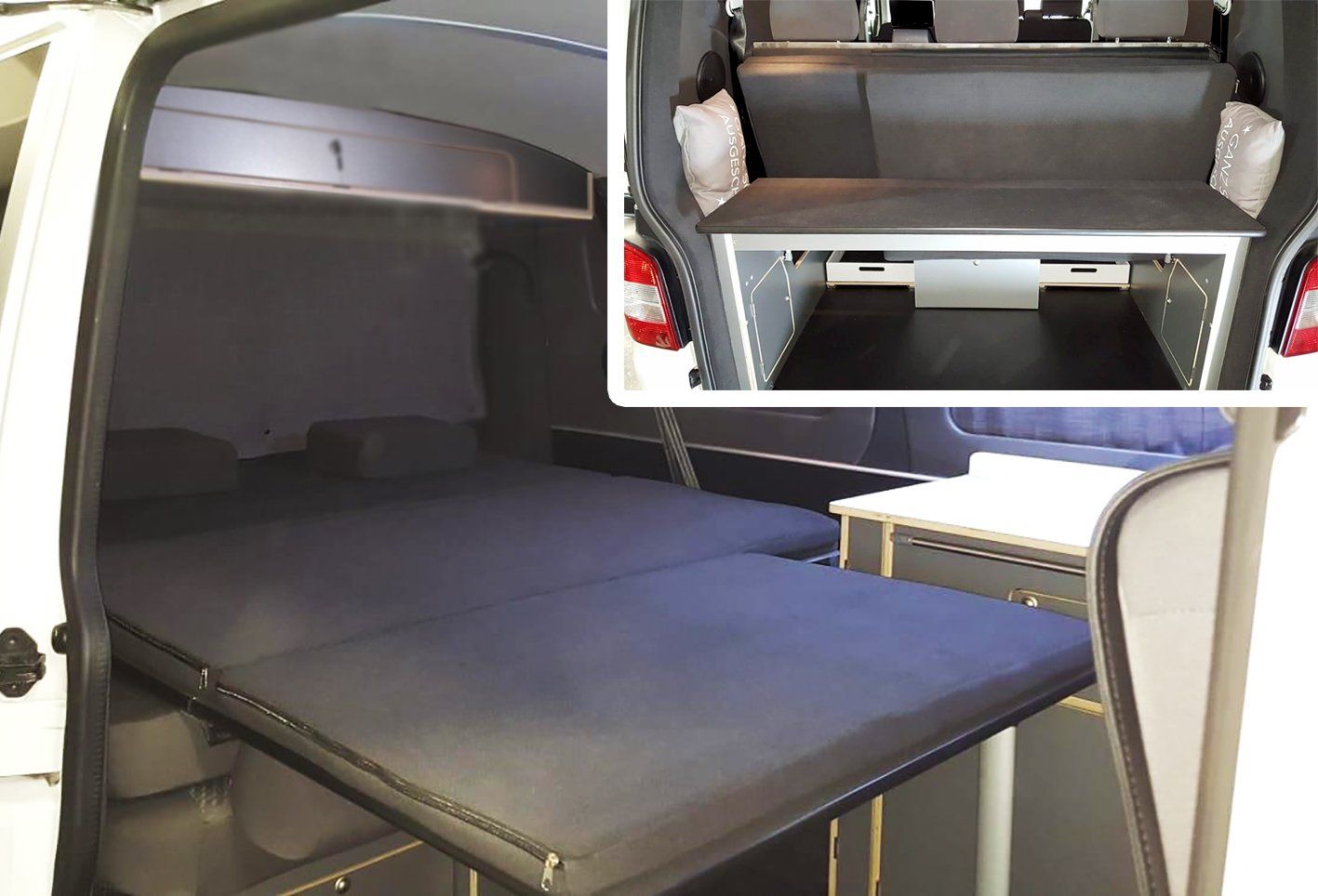 Das Bett lässt sich bei Nicht-Nutzung Platz sparend zusammenklappen. Für eine erholsame Nacht kann man es, perfekt in den Innenraum angepasst, ausklappen.