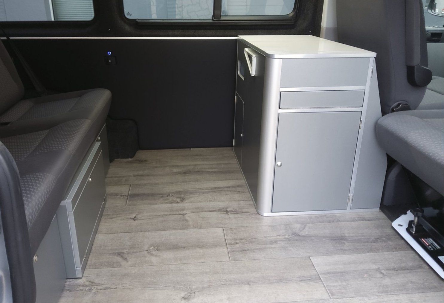 Das Küchenelement wird passgenau eingebaut, um genug Stauraum zu bieten, aber den Fahrkomfort nicht einzuschränken.